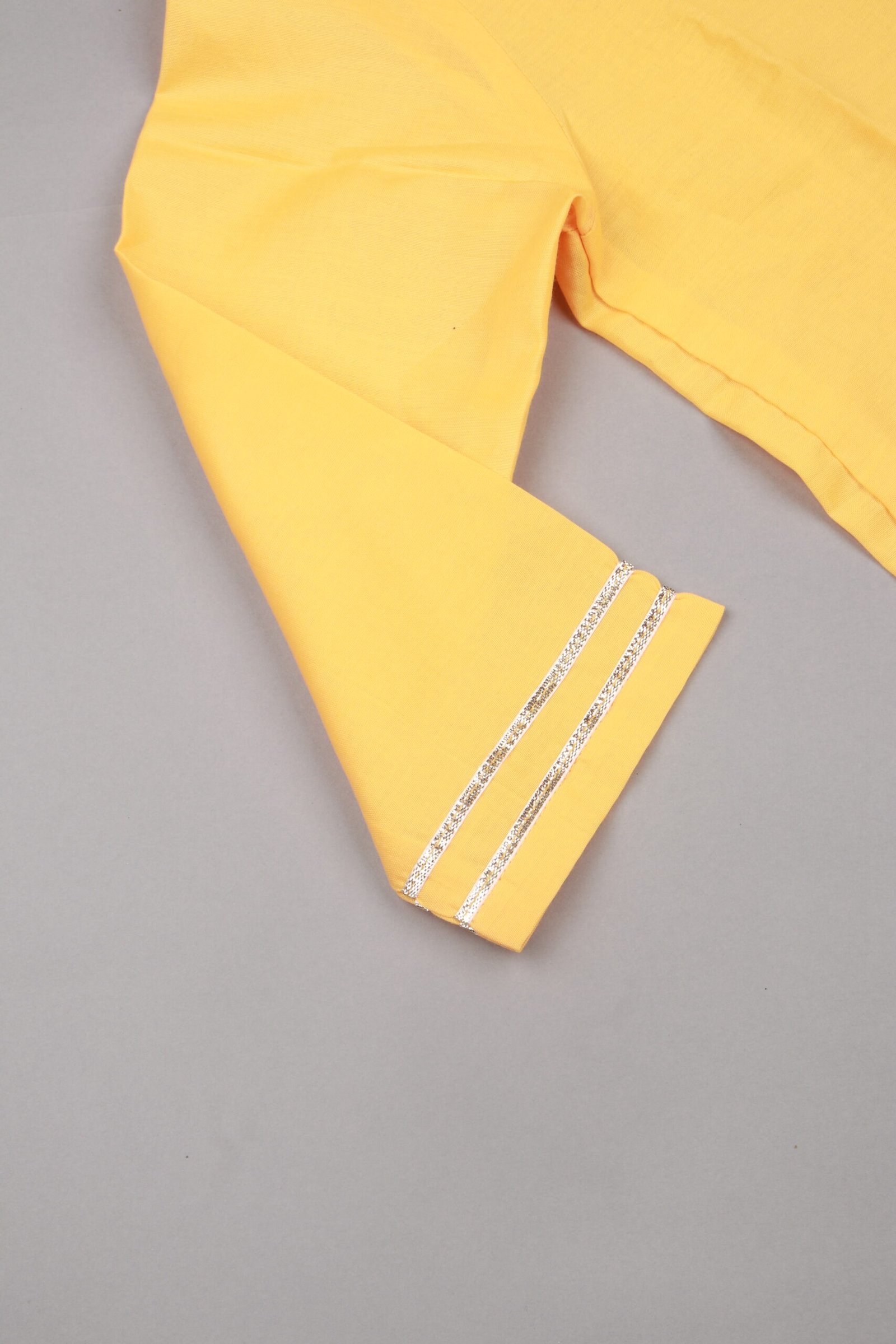 The kurta boasts a classic mandarin collar and a button placket, adding a touch of sophistication to the outfit. The white pajama complements the yellow kurta, creating a balanced and stylish ensemble.