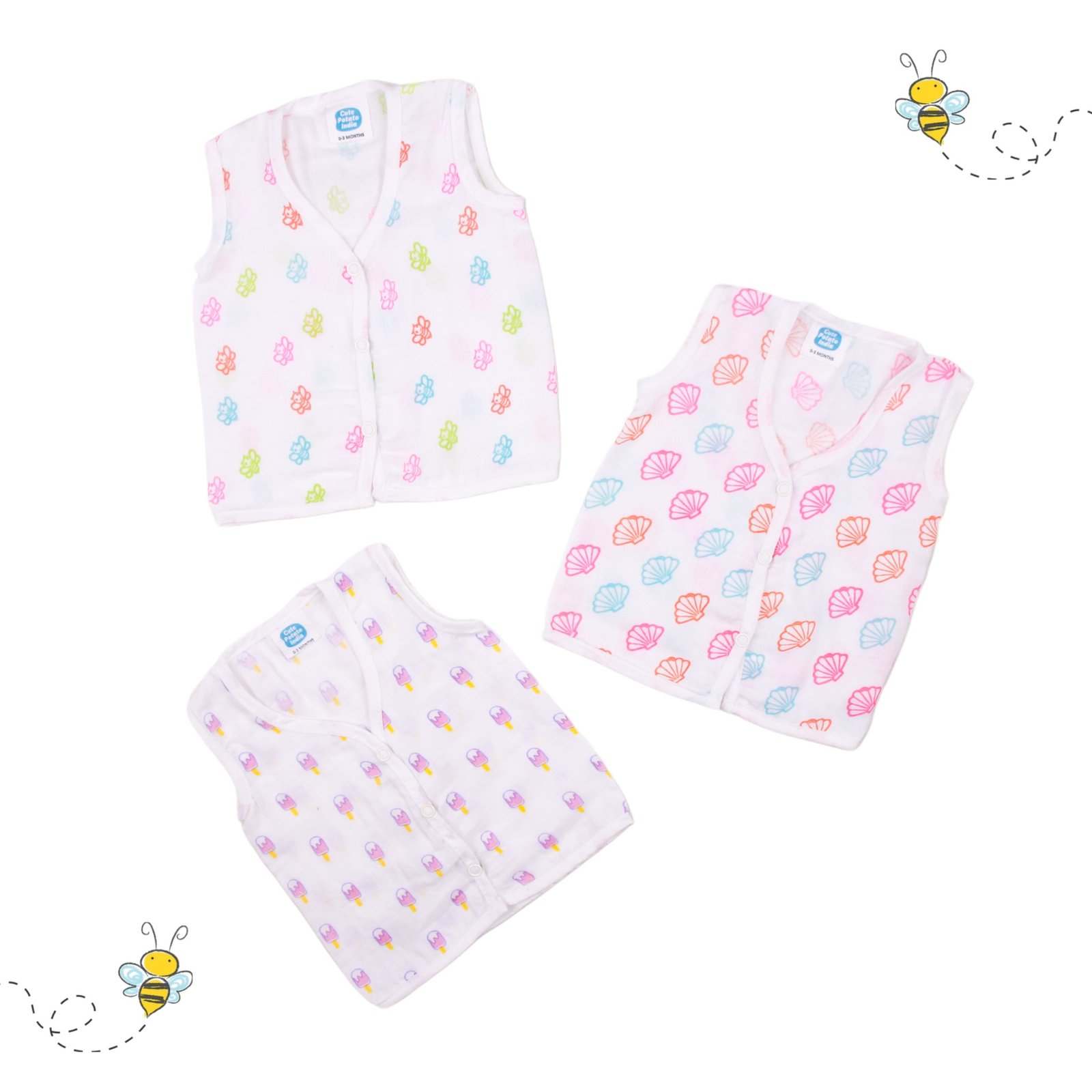 Set of 3 Muslin Cotton Baby Vests โ Bee, Shell & Ice Cream Print | Soft Front-Open Jhablas