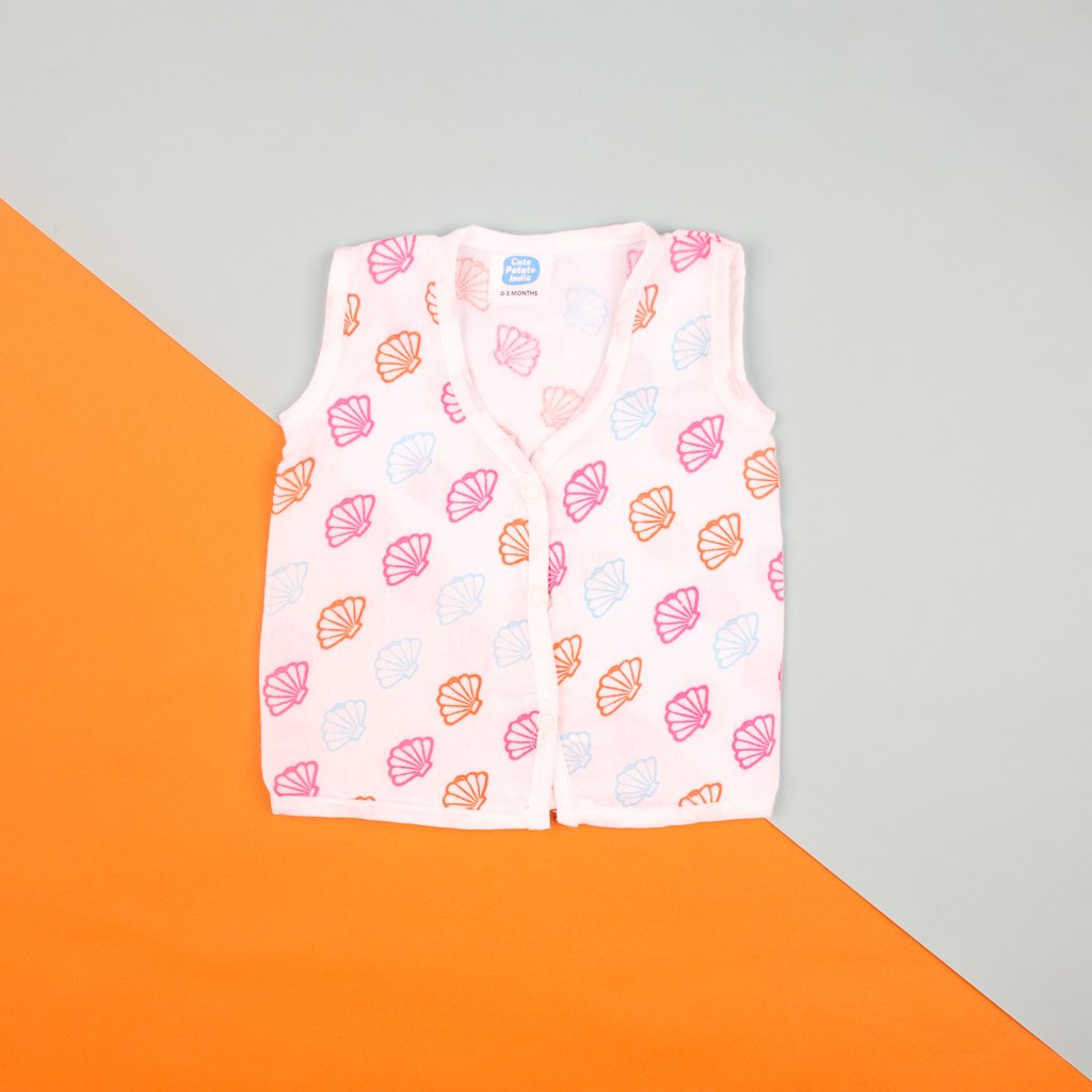 Baby Muslin Cotton Front-Open Vest โ Pink Shell Print Jhabla