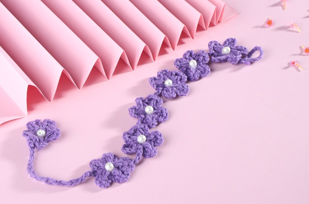 This stunning handmade crochet necklace in a regal shade of purple is a charming accessory for little girls. The delicate crochet work is complemented by elegant pearls, creating a graceful and sophisticated look. Soft, lightweight, and skin-friendly, this necklace ensures comfort while adding a touch of timeless beauty to any outfit. Whether for a special event or everyday wear, this exquisite necklace is a perfect choice for young fashionistas.
