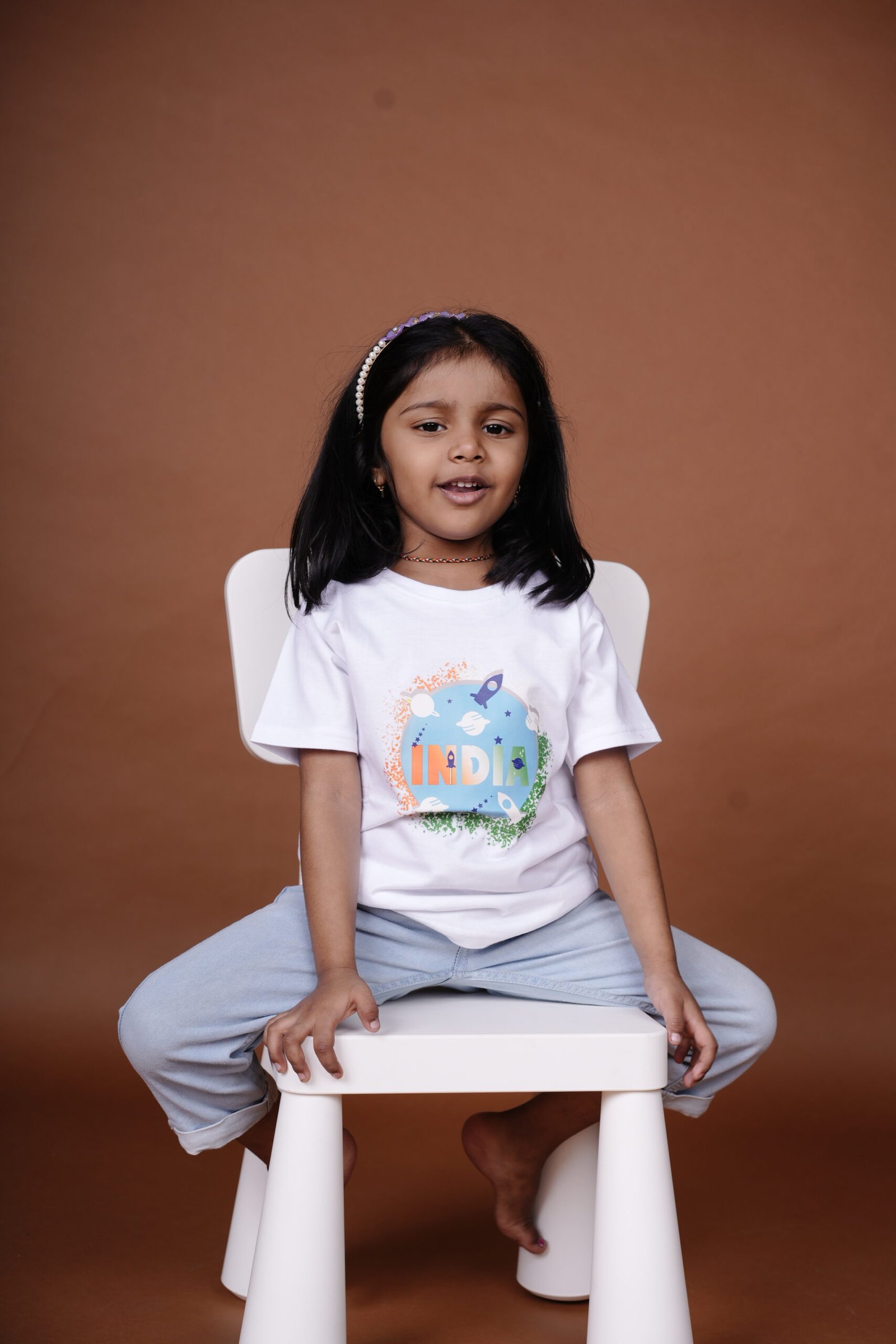 One of the best things about a classic white t-shirt is its versatility. The India Space Print adds a unique twist that makes styling fun and easy. Here are a few ways to dress up your little one in this piece: