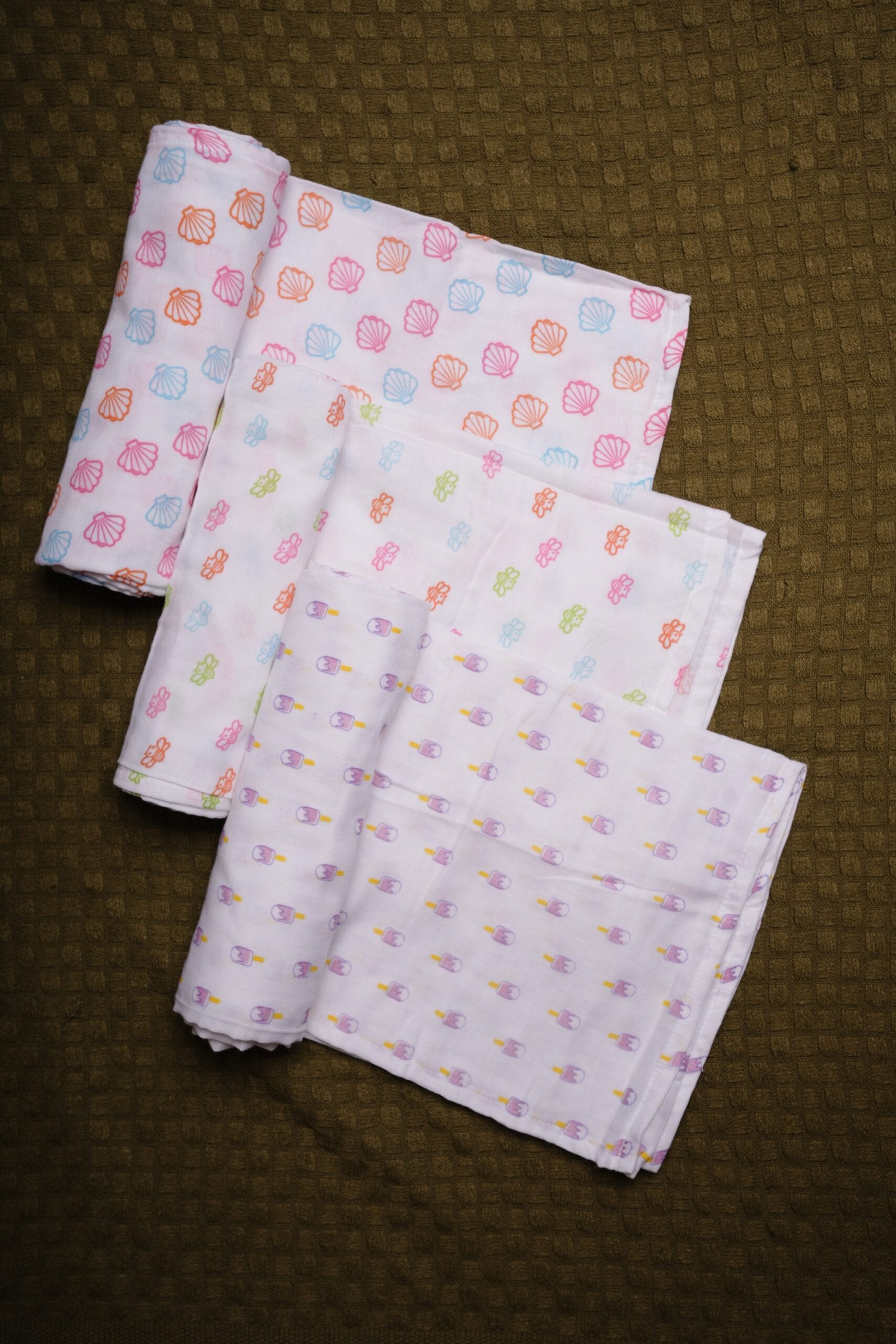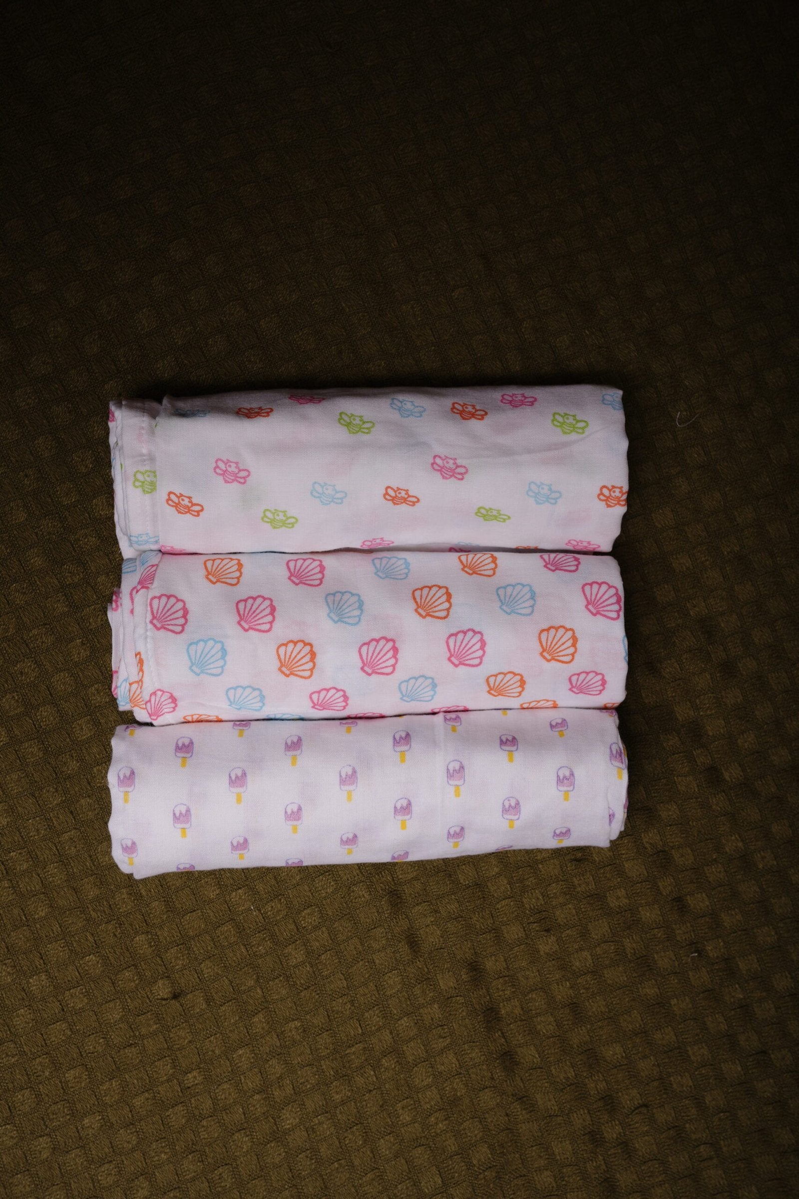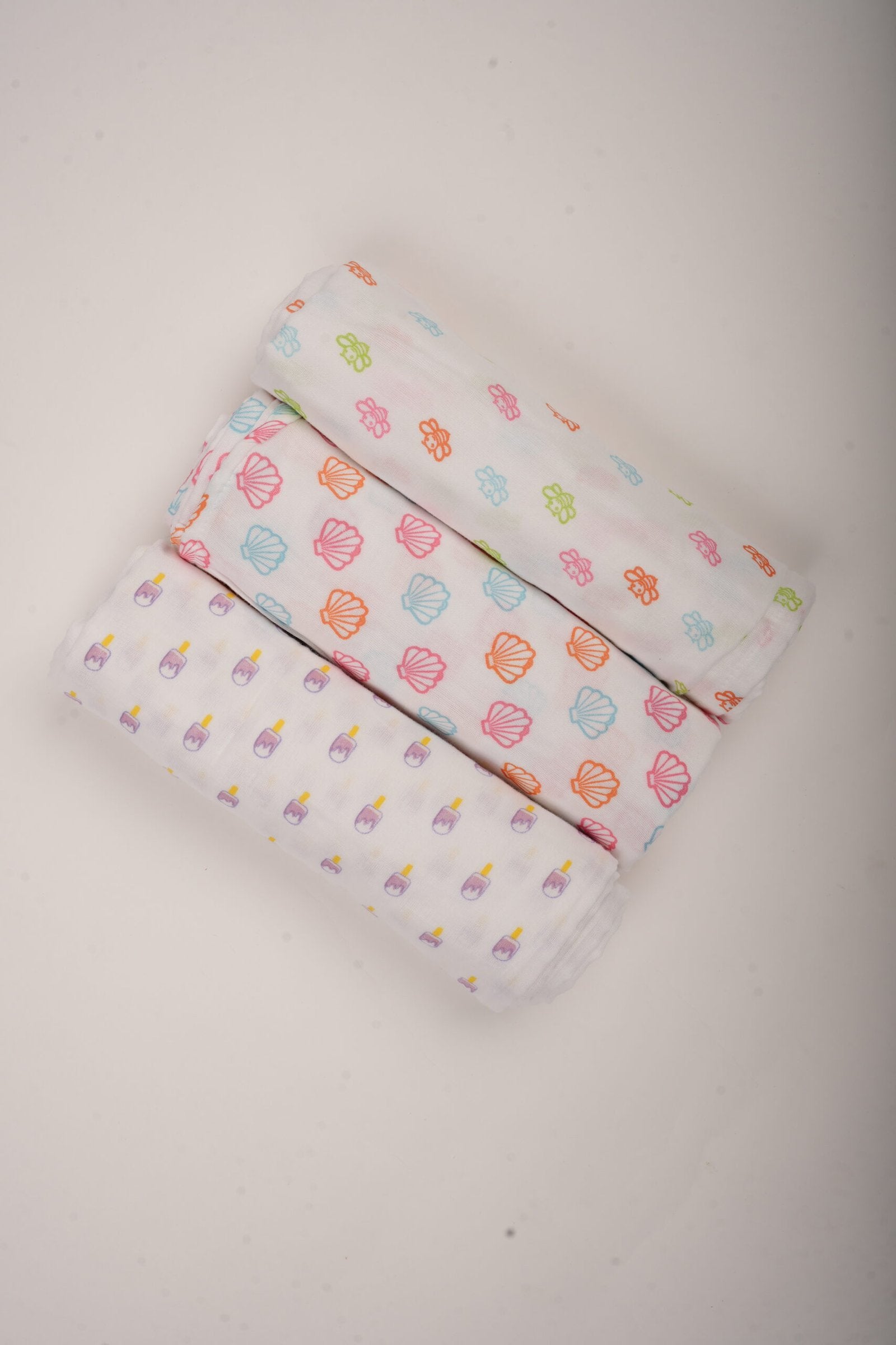A set of 3 soft muslin swaddles in Honey Bee, Popsicles and Seashell prints. Breathable, gentle on newborn skin and built for daily use. Always have a fresh one ready.