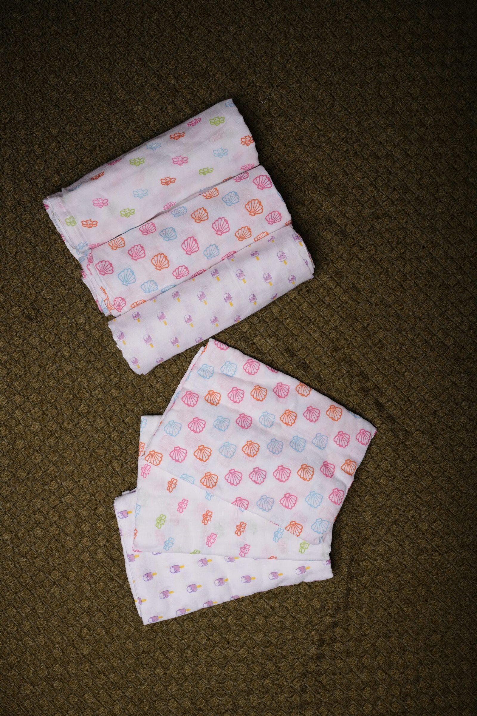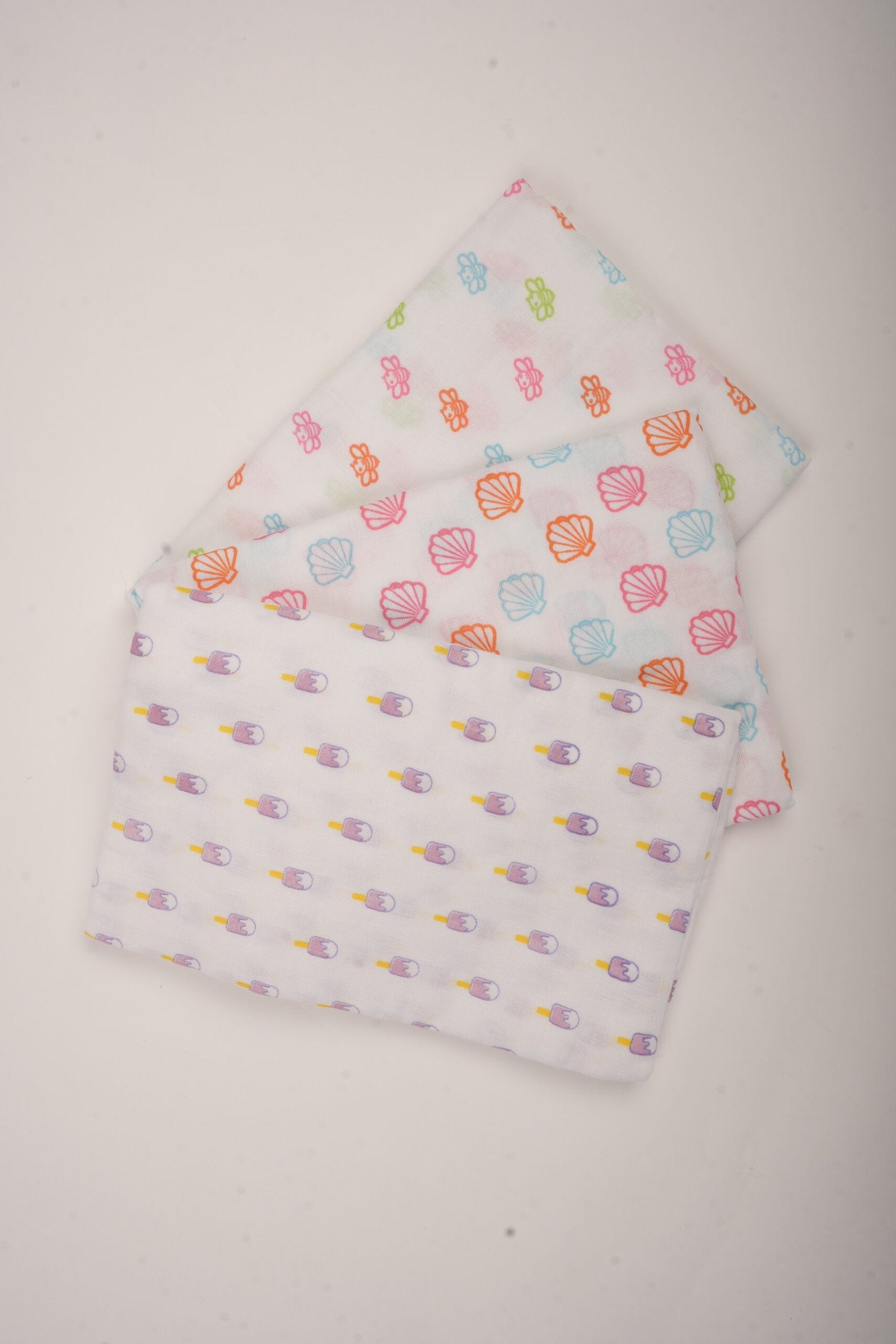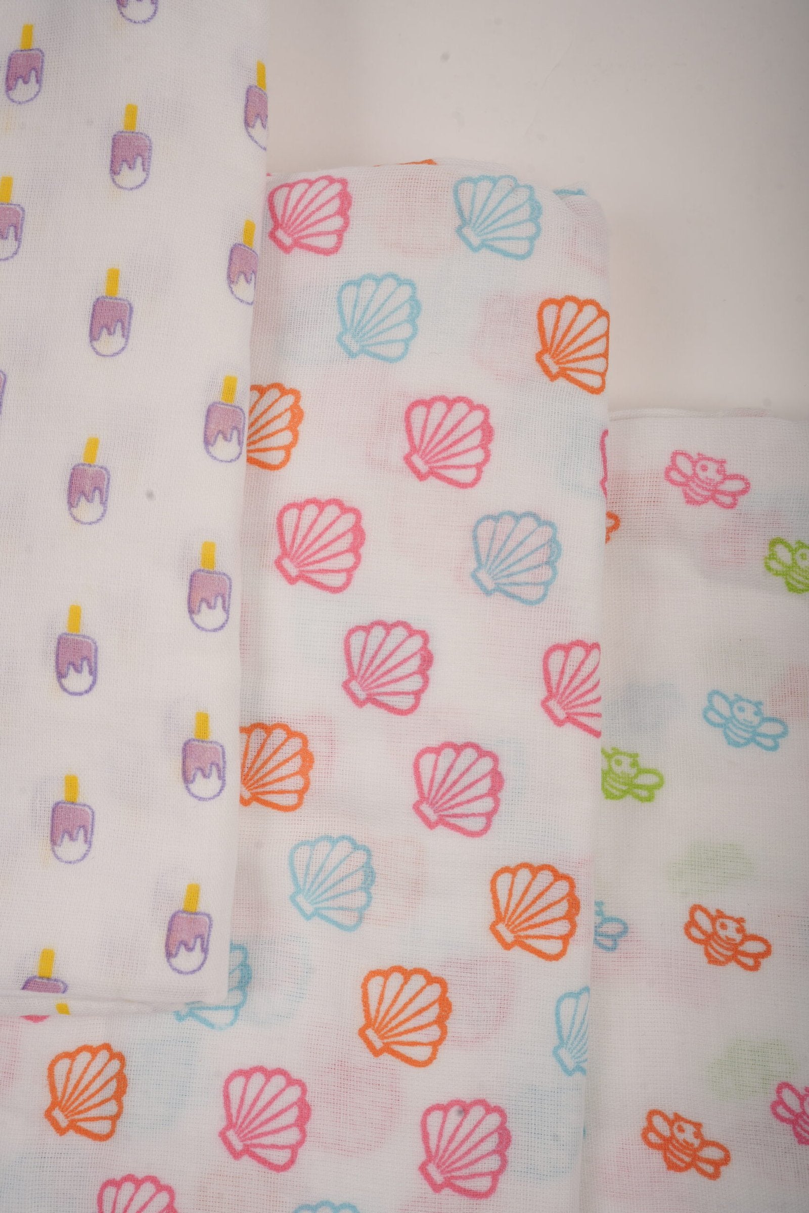 Material: 100% Premium Breathable Muslin Cotton Set Includes: 3 swaddle blankets Prints: Honey Bee, Popsicles, Seashell Suitability: Newborns to 12 months and beyond Season: All season, suited for Indian climate Safety: Free from harmful chemicals and azo dyes Origin: Made in India