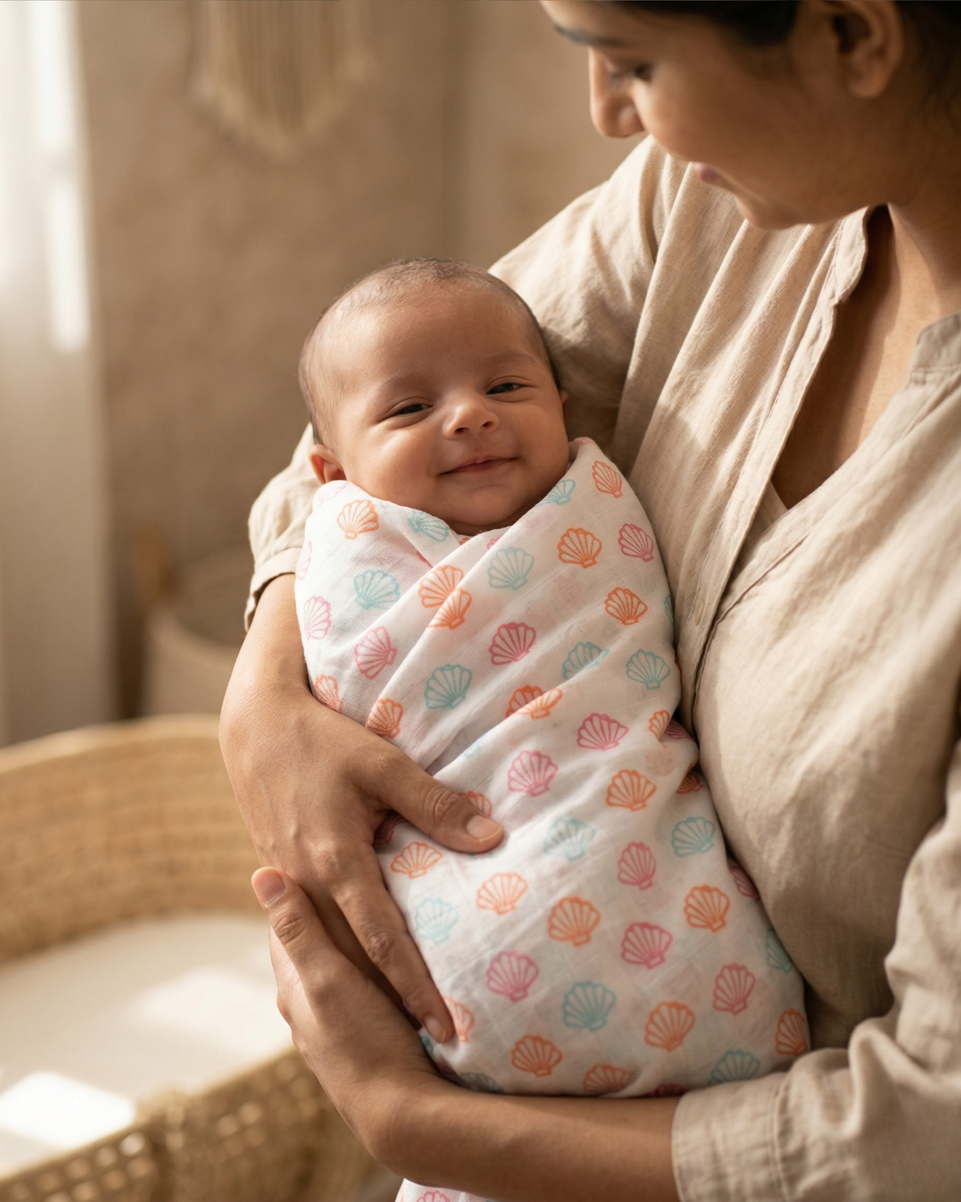 Muslin has been used for baby clothing and wrapping for generations. The open weave lets air move freely which keeps your baby cool and dry. In India where heat and humidity vary through the year, this makes a real difference. Our swaddles are made from 100% premium muslin cotton, free from harmful chemicals and azo dyes, and safe against the most sensitive newborn skin. They get noticeably softer with every wash.